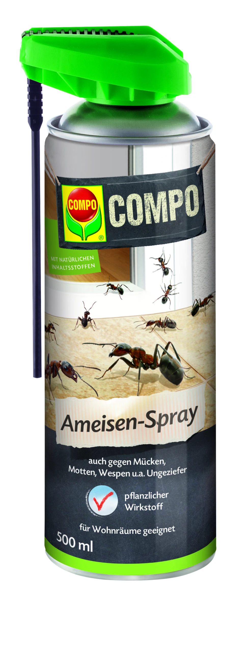 Das COMPO Ameisen-Spray N beseitigt blitzschnell und zuverlässig Ameisen auf Wegen, Terrassen und auch im Haus. Dank des praktischen Kombi-Sprühkopfes kann das Spray als Sofortbehandlung oder als Raumspray verwendet werden. Dank der Schlauchverlängerung ist eine gezielte Anwendung auch an schwer zugänglichen Stellen, wie in Fugen und an Mauerritzen, möglich. Das Produkt basiert auf einem Wirkstoff aus der Natur und wird aus der Blüte der Chrysanthemen gewonnen. Der Einsatz der Schlauchverlängerung garantiert keine Sprühnebelbildung. Das Spray findet ebenfalls Anwendung bei der Bekämpfung von Motten, Mücken, Schaben oder Silberfischchen.