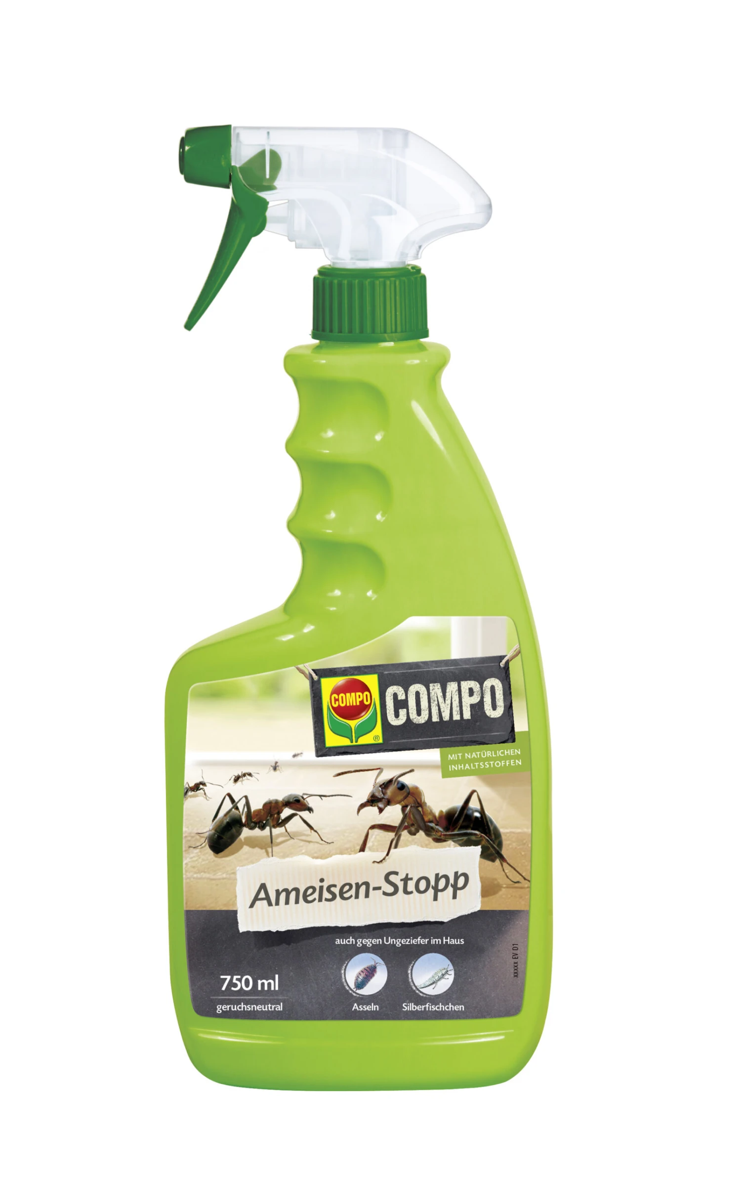 Das COMPO Ameisen-Stopp N ist eine anwendungsfertige Lösung mit Dauerwirkung. Es bekämpft zuverlässig Ameisen, Silberfischchen, Asseln und Schaben auf Terrassen, Wegen und im Haus. Der natürliche Wirkstoff wird aus der Blüte der Chrysanthemen gewonnen und besitzt eine Langzeitwirkung von bis zu 3 Monaten. Der Wirkstoff wird erst durch den Kontakt und der Aufnahme von Insekten freigesetzt. Geruchsbelästigungen treten bei diesem Produkt nicht auf.