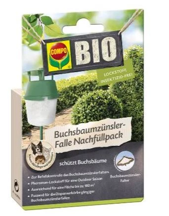 COMPO BIO Buchsbaumzünsler Falle Nachfüllpack für die Compo Buchsbaumzünsler Falle. Der Nachfüllpack bekämpft effektiv den Buchsbaumzünslerfalter mit natürlichen Pheromonen. Der männliche Buchsbaumzünslerfalter wird durch den Sexuallockstoff in die Falle gelockt und kann nicht mehr aus dem Behälter heraus, dadurch bleiben die weiblichen Falter unbegattet und legen keine befruchteten Eier mehr ab. Dieser Nachfüllpack ist ausreichend für eine komplette Gartensaison (Pheromon wirkt von März bis Oktober) und schirmt eine Fläche von bis zu 180 m² ab. Es wird völlig insektizidfrei gearbeitet und ist dadurch auch für Kinder, Haustiere und nützliche Insekten wie Bienen und Hummeln unbedenklich. Die Pheromon-Dispenser passen auch in andere Dispenserkörbe der gängigen Buchsbaumzünsler-Fallen.