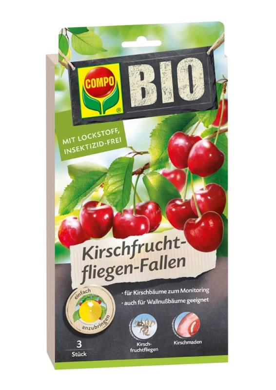 Ab Mai legen die Weibchen der Kirschfruchtfliegen bis zu 200 Eier an die noch gelben Kirschen. Dabei wird meist nur ein Ei pro Kirsche abgelegt. Sonnige Plätze in den Baumkronen werden bevorzugt. Die 4-6 mm lange Made bohrt sich dann in die Kirsche hinein und zerfrisst das Fruchtfleisch um den Kern herum. Die Frucht wird daraufhin matt, weich und faulig. Anschließend verlassen die Maden die Frucht und verpuppen sich im Boden. Mit der COMPO Kirschfruchtfliegen-Falle werden die Weibchen abgefangen, sodass die Eiablage verhindert wird. Die Falle dazu von Mitte Mai bis Ende Juni besonders an den sonnigen Plätzen im Baum anbringen. Vorbeugend sollten alle heruntergefallenen Früchte eingesammelt und vernichtet werden, solange sich die Maden noch darin befinden (nicht kompostieren). Alle Früchte restlos abpflücken und den Boden so bearbeiten (auflockern), dass die Maden im Winter absterben.