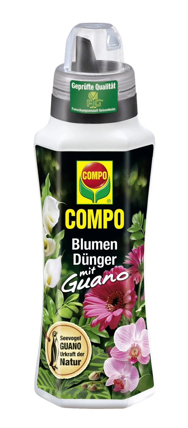 Der organisch-mineralische COMPO Blumendünger mit GUANO hat einen besonders hohen Anteil an echtem COMPO GUANO Naturdünger und Magnesium. Aufgrund der unvergleichlichen Zusammensetzung aller Haupt- und Spurennährstoffe, Magnesium und wertvollen Guano-Vitalstoffen ist der Dünger bestens für die besonderen Anforderungen von stark zehrenden Balkonblumen (z. B. Geranien, Surfinien) und empfindlichen Zimmerpflanzen (z. B. Orchideen, Usambaraveilchen) abgestimmt. Dieser milde und einzigartige Spezial-Flüssigdünger sorgt für schöne und widerstandsfähige Pflanzen.