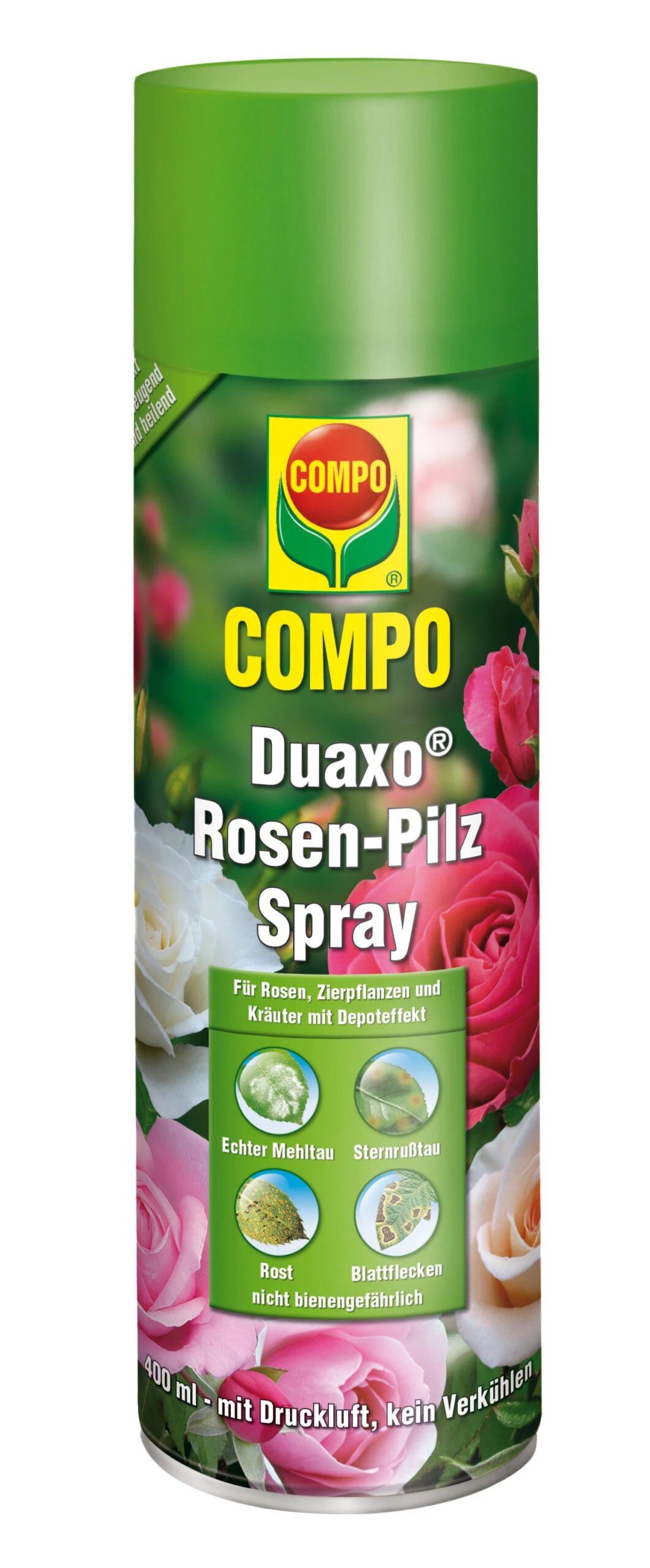 Das COMPO Duaxo Rosen-Pilz Spray schützt Rosen, Zierpflanzen und Kräuter vor häufigen Pilzkrankheiten. Es ist in Innenräume, auf dem Balkon, auf der Terrasse, im Gewächshaus und im Garten anwendbar. Es hilft gegen Echten Mehltau, Rost, Sternrußtau und Blattflecken. Bienen und andere Nützlinge werden geschont. Das Spray ist anwenungsfertig und besitzt ein feines Sprühbild. Des Weiteren ist es geruchsneutral und sauber in der Anwendung.