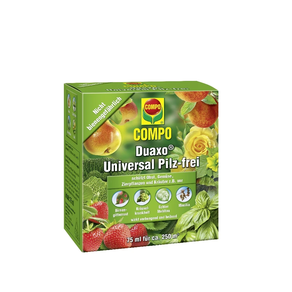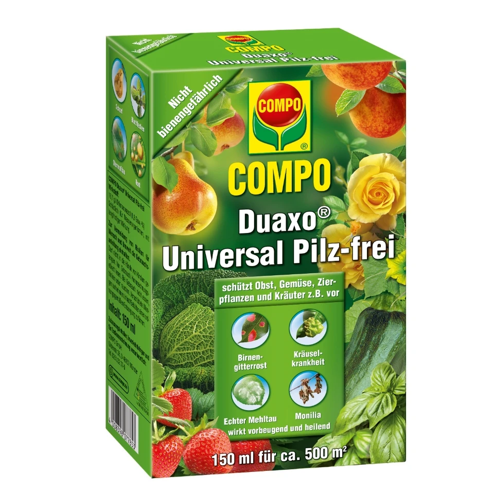 Das COMPO Duaxo Universal Pilz-frei ist ein neuartiges, systemisch wirkendes Pilzbekämpfungsmittel, welches speziell zum Schutz der Pflanzen im Garten entwickelt wurde. Es kann an Obst, Gemüse und Zierpflanzen gegen Echten Mehltau, Birnengitterrost, Kräuselkrankheit, Rost, Schorf, Rutensterben und viele Arten von Blattfleckenpilzen eingesetzt werden. Der Wirkstoff wird schnell aufgenommen und schützt vor beginnenden und stoppt vorhandene Infektionen. Das Produkt ist nicht bienengefährlich.