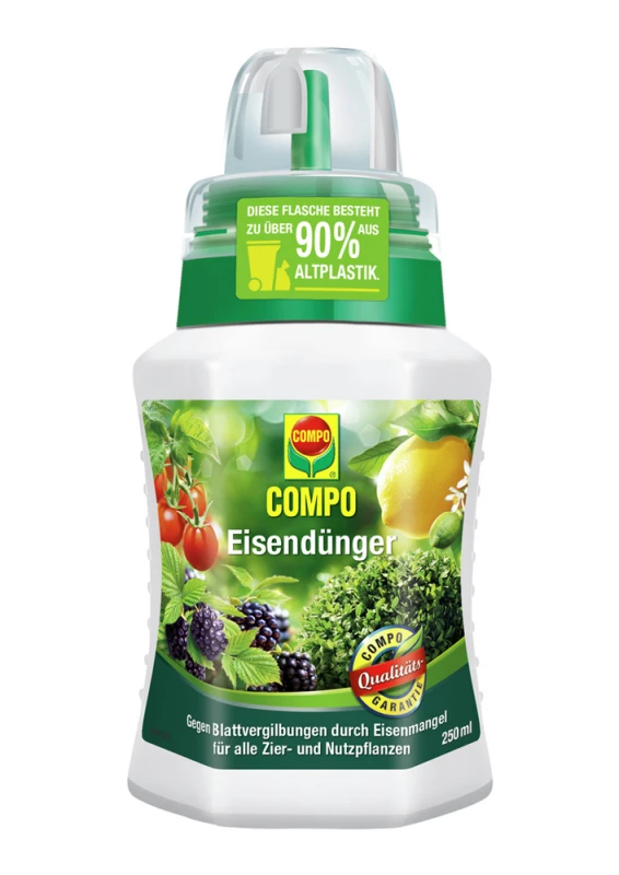 Spezialdünger gegen Blattvergilbungen durch Eisenmangel für alle Zier- und Nutzpflanzen. Vorbeugende Wirkung bei Kulturen, welche zu Eisenmangel neiden wie z.B. Petunien, Surfinien, Zitrusfrüchte oder Tomaten. Bei akuten Mangelsymptomen schnelle Wirkung und Unterstützung für ein sattes Blattgrün. Zur einfachen Gießanwendung. Anwendung: Für alle Zimmer-, Balkon-, Garten- und Terrassenpflanzen.