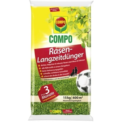 Der Compo Rasen-Langzeitdünger ist ein hochwertiges Spezialprodukt und eignet sich bestens zur Pflege von Zier-, Sport- und Spielrasen. Der Langzeitdünger versorgt Ihren Rasen im Frühjahr oder nach einer Neuanlage langfristig und nachhaltig mit den allen wichtigen Nährstoffen. Das Ergebnis ist ein tiefgrüner, dichter und robuster Rasen ohne Moos und Unkraut. Dreiviertel aller deutschen Bundesliga Stadien verwenden Compo Rasendünger. Der Inhalt von 15 kg reicht für 600 m² Rasenfläche.