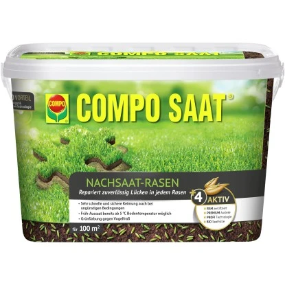 Compo Saat Nachsaat-Rasen ist eine hochwertige Mischung mit Spitzensorten gemäß RSM (Regel-Saatgut-Mischungen), die eine schnelle und zuverlässige Nachsaat bietet. Schneller Lückenschluss und sichere Keimung dank einzigartigem Bio-Turbo. Mit Grünfärbung gegen Vogelfraß. Anwendungszeitraum: April bis Oktober (2 kg für 100 m²).