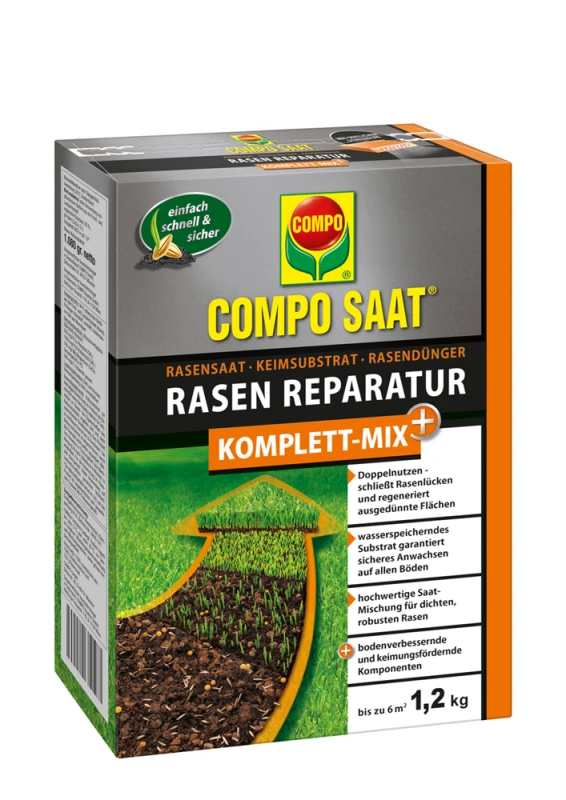 Rasensaat + Keimsubstrat + Rasendünger + bodenverbessernde und keimungsfördernde Komponenten Doppelnutzen – schließt Rasenlücken und regeneriert ausgedünnte Flächen. Wasserspeicherndes Substrat garantiert sicheres Anwachsen auf allen Böden. Hochwertige Saat-Mischung für dichten, robusten Rasen.