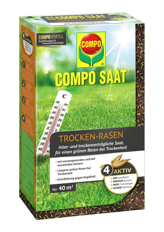 Spitzensorten für tiefgrünen, widerstandsfähigen Trocken-Rasen (RSM 2.2.2). Wassersparende Gräser. Sichere Keimung dank wirkaktiven Keimbeschleuniger.