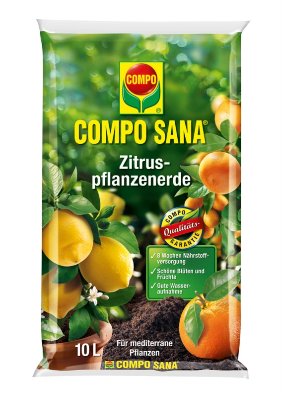 Hochwertige Spezialerde für alle Zitruspflanzen und mediterrane Pflanzen. Der auf die Bedürfnisse der Pflanzen abgestimmte Sofort- und Langzeitdünger gewährleistet eine bis zu 12 Wochen optimale Nährstoffversorgung. Hochwertige Tonmineralien speichern Nährstoffe und geben diese bedarfsgerecht an die Pflanze ab. Dies gewährleistet die Bildung gesunder Früchte und intensiver Blüten. Ausgewählter Quarzsand sichert eine optimale Luft- und Wasserzufuhr – auch bei heißer Witterung. Anwendung: Gebrauchsfertiges Kultursubstrat zum Ein- und Umtopfen von Zitruspflanzen und anderer mediterranen Pflanzen. Nach ca. 12 Wochen ist eine Nachdüngung erforderlich.