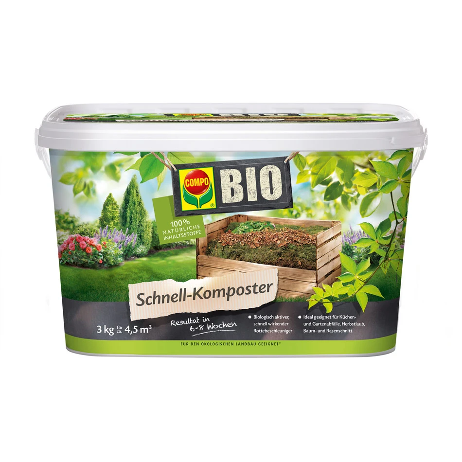 Der COMPO Schnell-Komposter mit Guano beschleunigt den Rotteprozess. Der Kompostbeschleuniger wirkt schnell und enthält hochwertige Rohstoffe, welche innerhalb von 6-8 Wochen Mulchkompost von bester Qualität erzeugen. Wertvolles Seevogel-Guano wirkt unterstützend für die natürlichen Rottebakterien und fördert somit die ökologische Humusbildung. Seevogel-Guano besteht aus den Exkrementen von Seevögeln und ist reich an kostbaren Nährstoffen. Der einzigartige Nährstofflieferant wird bereits seit Jahrhunderten als natürlicher Dünger verwendet und trägt entscheidend zur sehr guten Qualität des Schnell-Komposters bei. Der COMPO Schnell-Komposter mit Guano ist besonders ertragreich – 3 kg reichen für ca. 4,5 m³ Kompost. Er eignet sich auch ideal zur Flächenkompostierung.