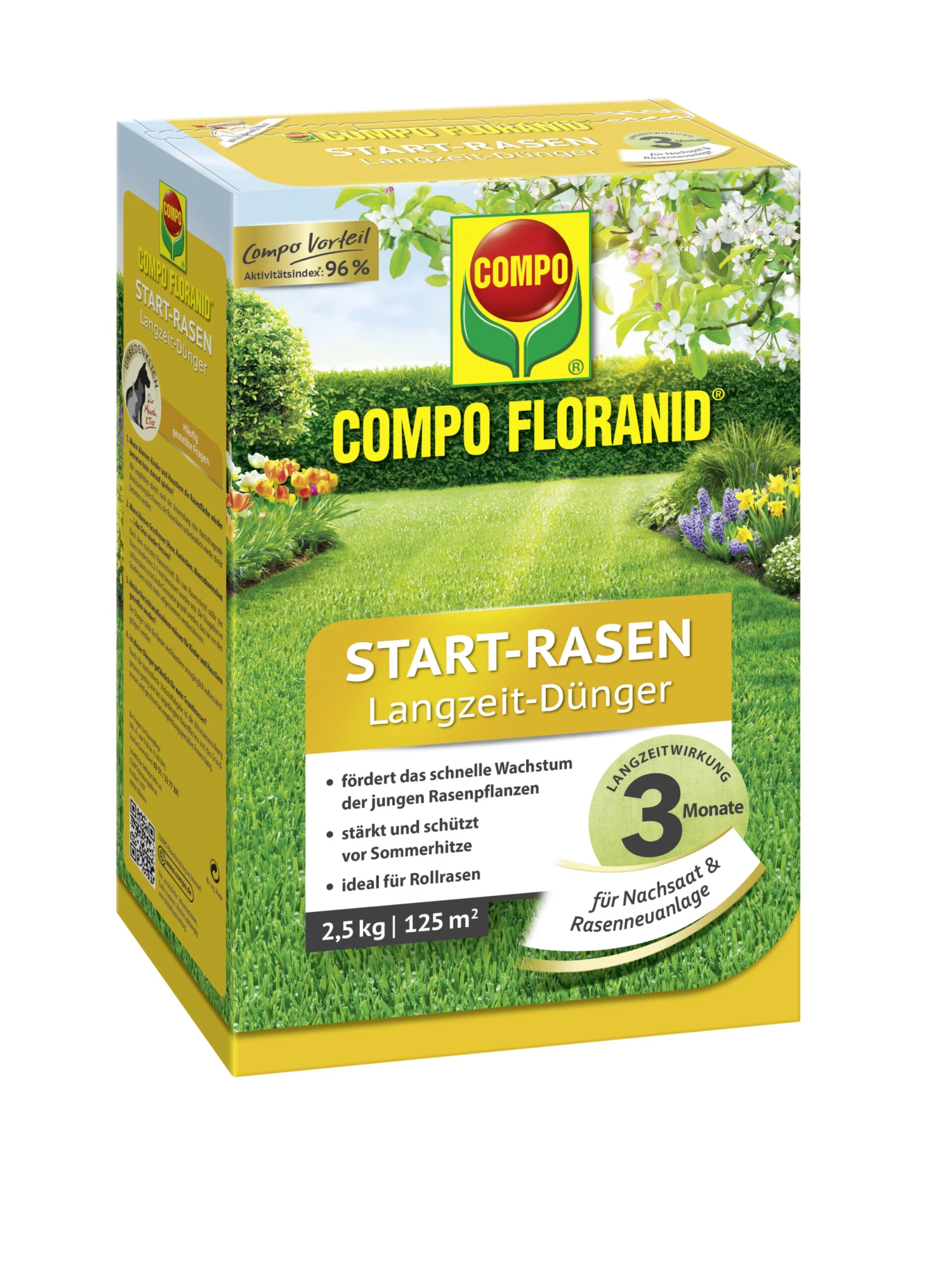 Über das Sortiment bietet COMPO innovativste Rasendünger an, die über eine unterschiedliche Kombination ausgewählter Langzeitdüngertechnologien für die perfekte Rasenpflege sorgen. Der für die COMPO Rasendünger kennzeichnende hohe Aktivitätsindex steht für die höchstmögliche Pflanzenverfügbarkeit des Langzeitdüngers und bietet die optimale Basis für einen gesunden und kräftigen Rasen. Die Produkte zeichnet sich besonders durch die feine, homogene und runde Granulatform aus. Alle Hauptnährstoffe (N = Stickstoff , K = Kalium) werden dabei in jedem Düngerkorn vorgehalten, wodurch gleichzeitig ein schnelles Auflöseverhalten gewährleistet ist. Ein kontrolliertes, gleichmäßiges Gräserwachstum ist garantiert und ein Stoßwachstum somit ausgeschlossen.